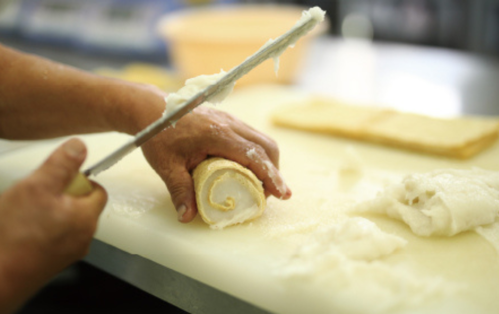 あげ巻用に作られた特製油揚げを広げ、中の豆腐状が見えるように開き、エソのすり身をのせて空気を抜きながら1本ずつ丁寧にノの字状に巻き、蒸しあげた逸品です。