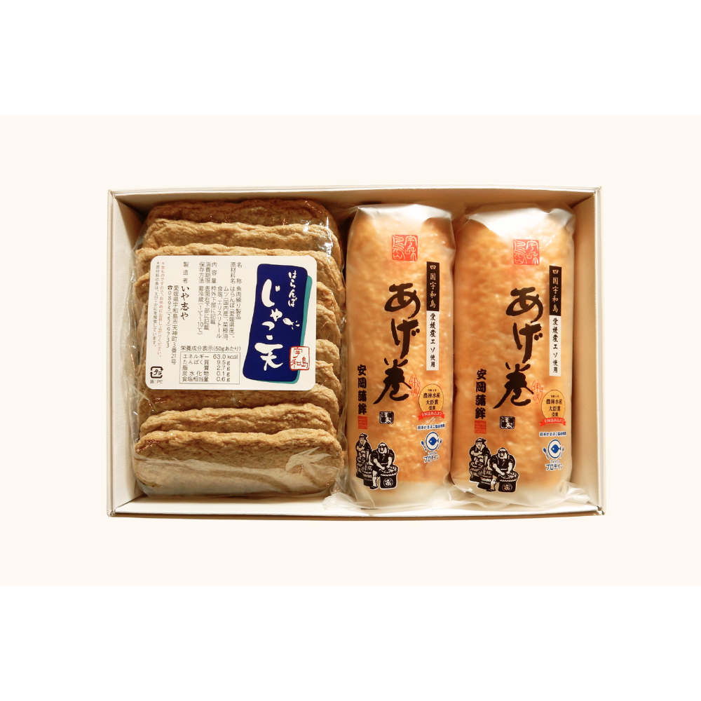 当店1番人気のじゃこ天と、愛媛県南予地方の特産品でかまぼこ1番人気のあげ巻を詰め合わせ。